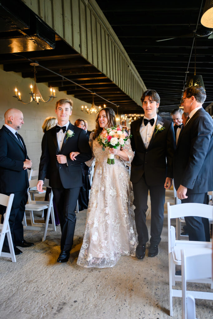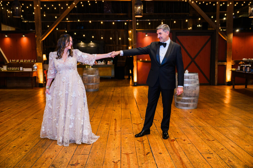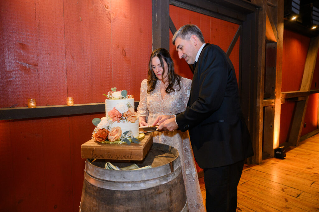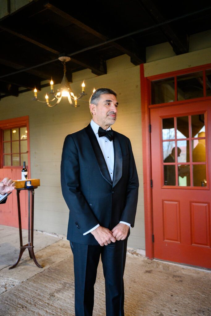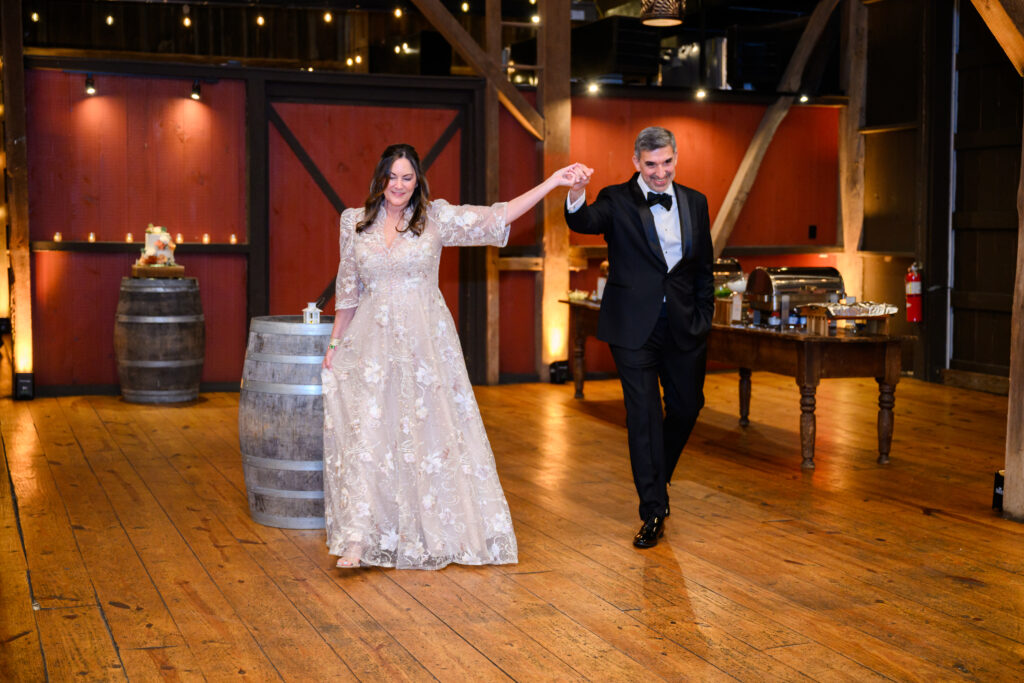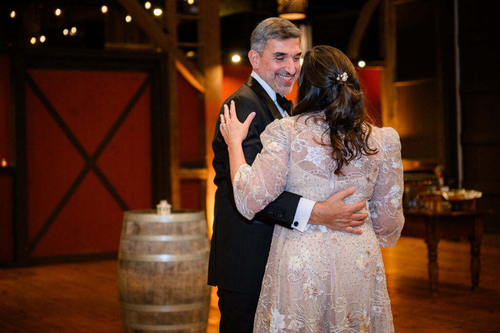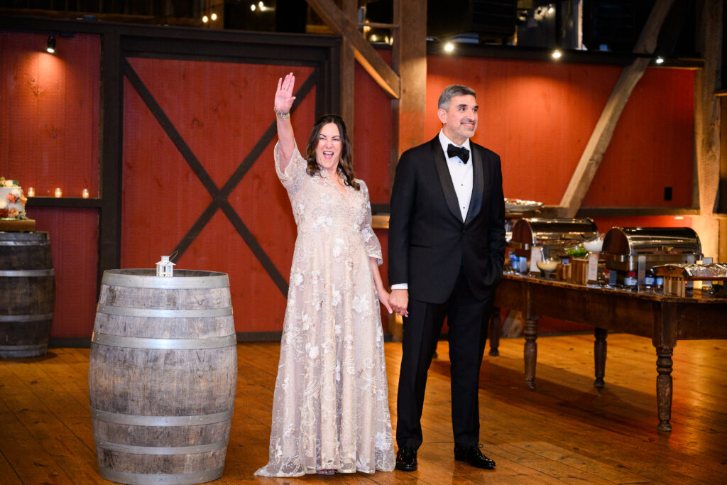 The couple chose the beautifully enclosed lower level of the barn, a charming, covered patio area, for their ceremony. This setting offered an intimate atmosphere while showcasing the rustic, upscale architecture the venue is known for.