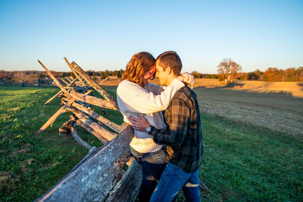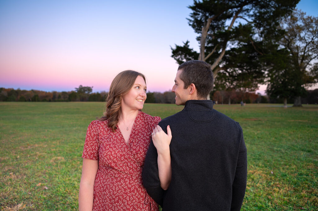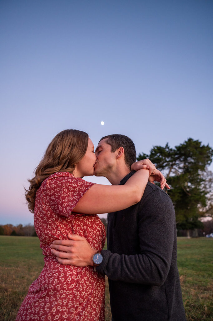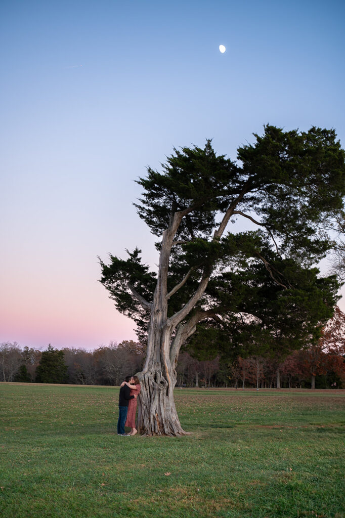 I met Andrea and Ovi at Manassas Battlefield Park for a stunning sunset engagement session. Their deep love was undeniable and truly shone through every moment of the session! They looked absolutely incredible after an outfit change, and I kept shooting right up until blue hour. What is blue hour? It’s the period of twilight when the sun is far below the horizon and the indirect sunlight takes on a beautiful, cool, deep blue tone; perfect for romantic, dramatic photos! I even managed to capture a few lovely images with the moon in the background. What a memorable session to capture their journey to the altar!
