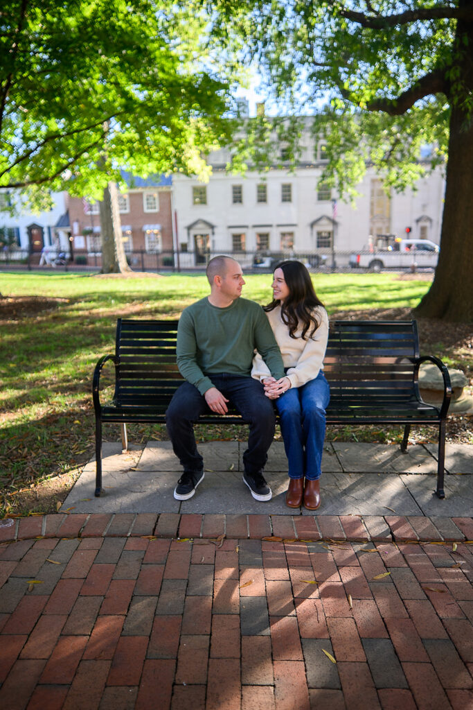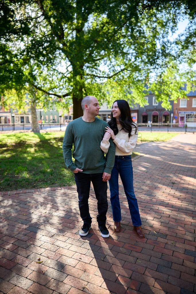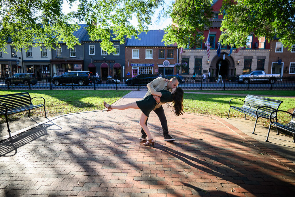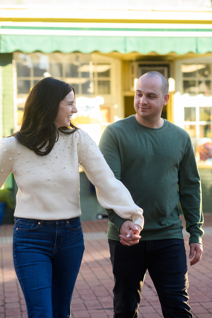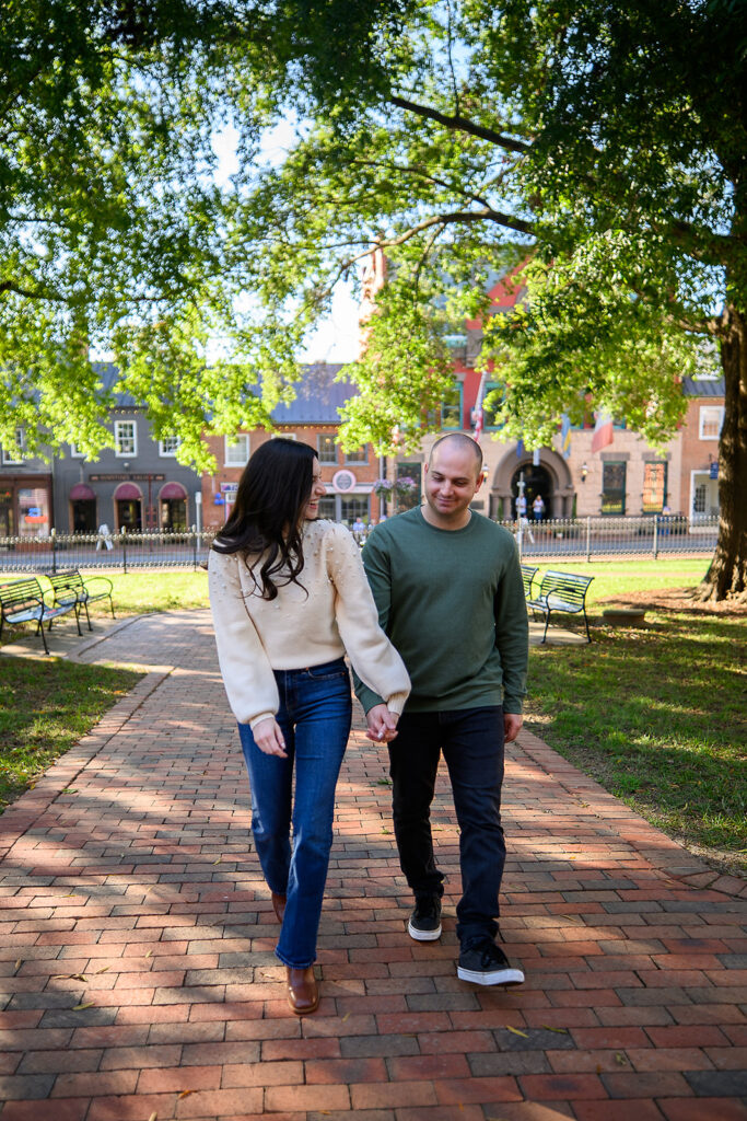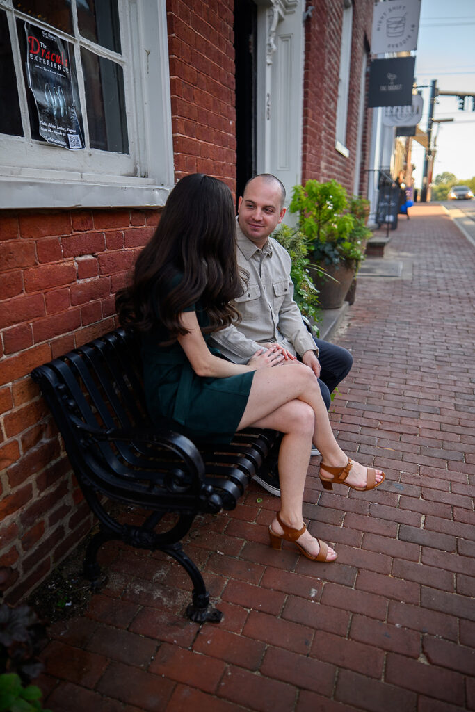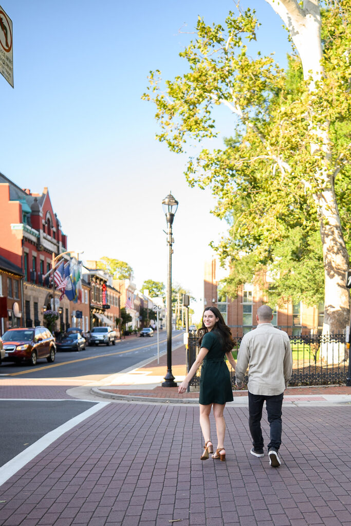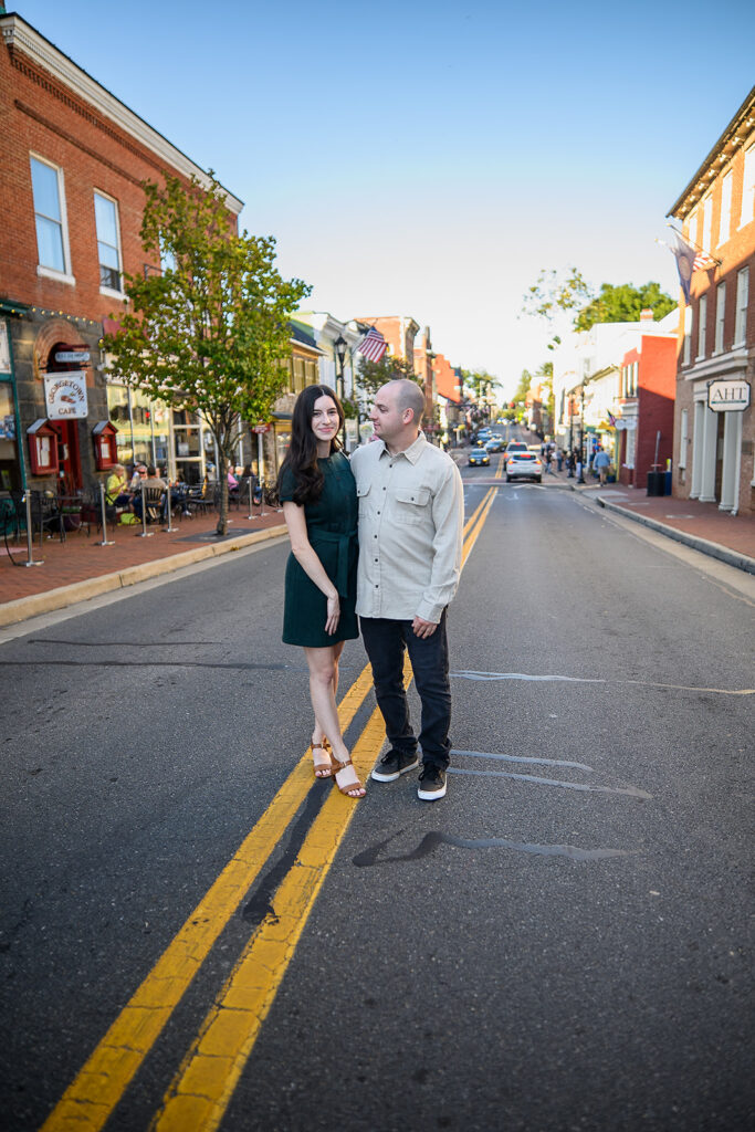 Downtown Leesburg is a fantastic setting because it offers so much classic character. The historic brick sidewalks, charming storefronts, and small-town feel provide a perfect backdrop for authentic, slice-of-life photos. I focused on capturing them in motion, walking, laughing, and interacting naturally, to emphasize their chemistry. Utilizing the architecture and small details of the town makes the pictures feel true to the local area and to their experience.