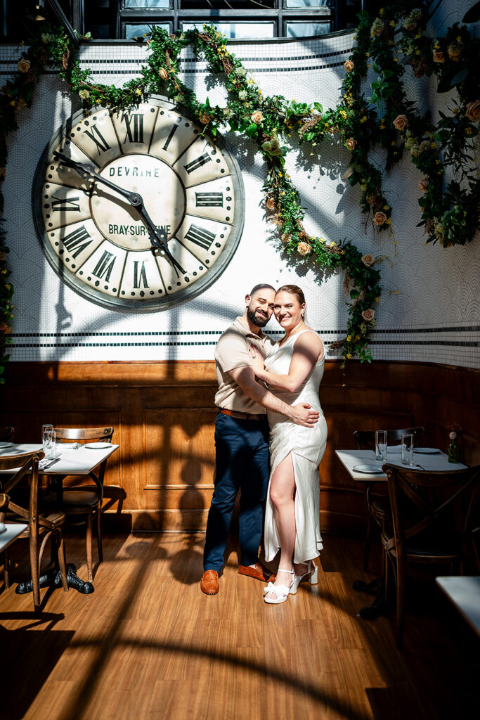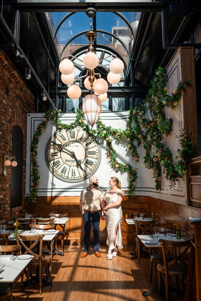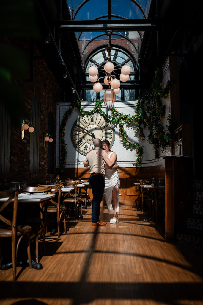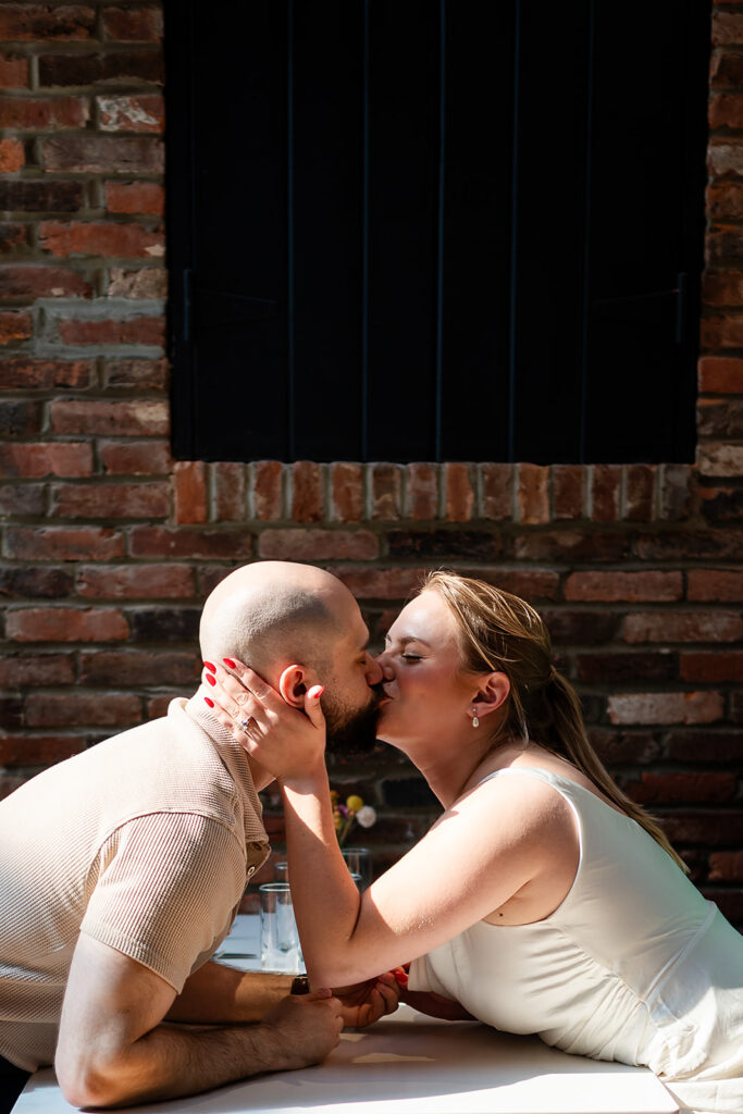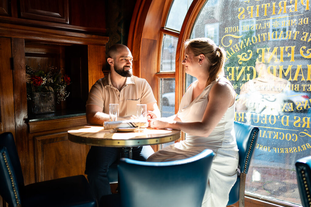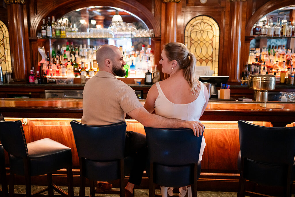 An indoor engagement session, especially at a location with such beautiful design, offers an incredibly sophisticated and intimate feel. Having private access to Josephine allowed me to use the stunning architecture as a focal point without any distractions. The dark wood, chic lighting, and sleek bar created a sense of moody elegance that perfectly suited Christen and Brent’s style. Don’t be afraid to think outside the box; a stylish restaurant or unique venue can make for truly memorable photos!