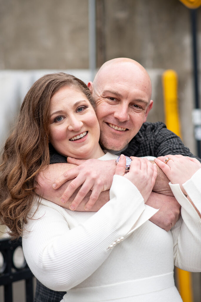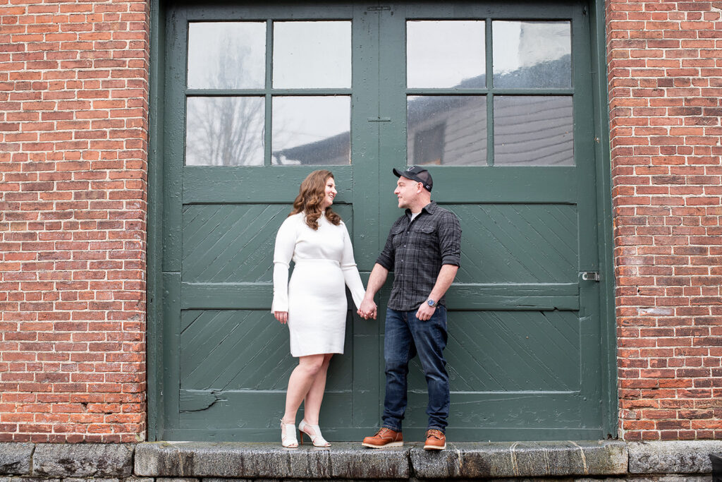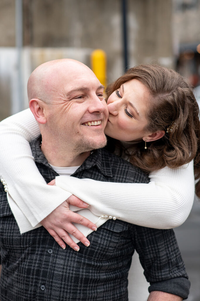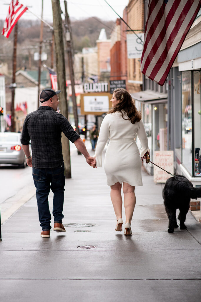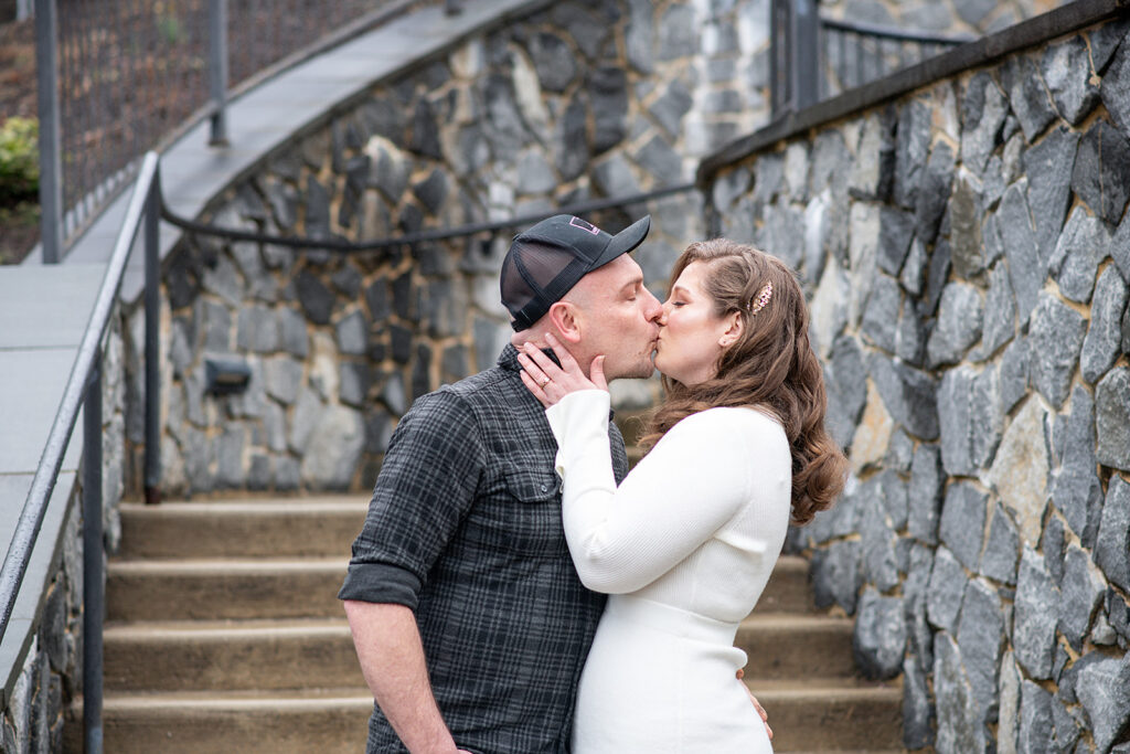 Their huge dog was a welcome (and adorable) addition! Including pets adds life and love to the photos and helps everyone feel more relaxed and playful. Claudia and Eddie were naturals, whether posing by a piece of local art or cuddling up on those cool, winding stairs I found. Their easygoing nature and deep love for each other were evident in every frame. I loved getting to explore this unique town with them, and I’m looking forward to their celebration!