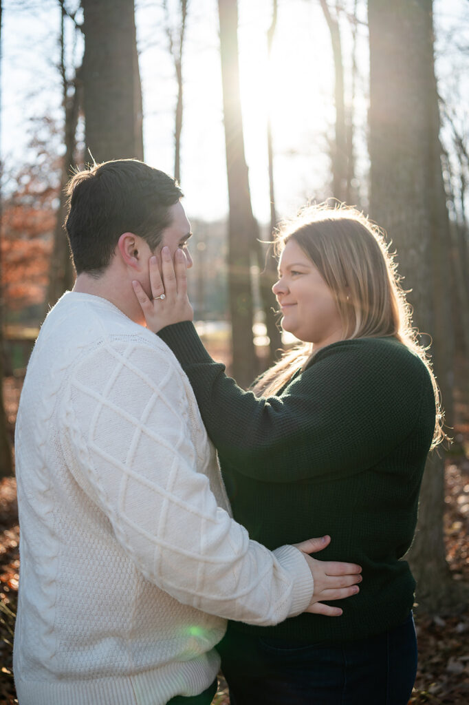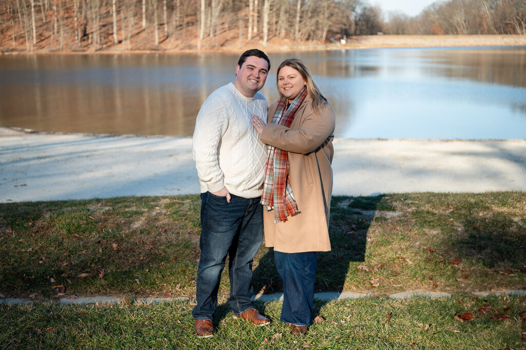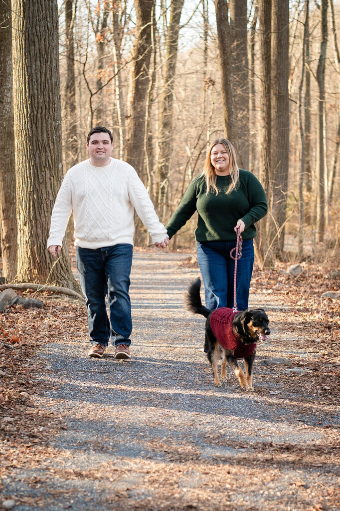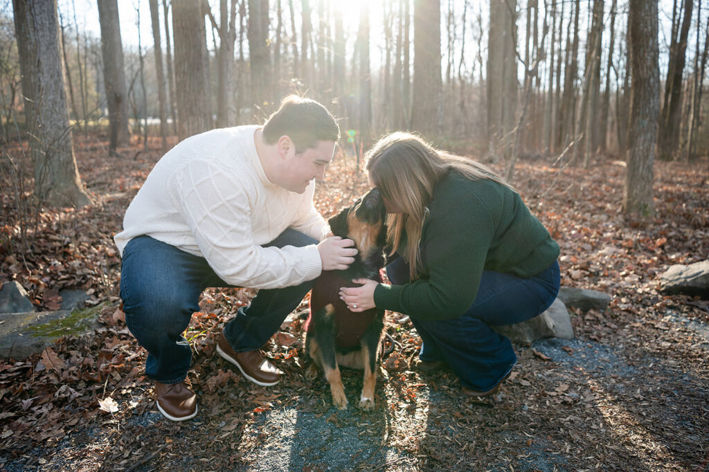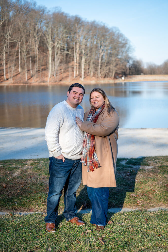 I met up with Jess and Chris on a cold winter day at a beautiful park featuring stunning scenes of water and woods. But the chill couldn’t touch the warmth of their connection! They brought their adorable dog, and I captured some truly amazing shots. I was lucky enough to catch the light just right, resulting in some images where the sun flare is pure magic, illuminating their love and making the whole scene glow. It was so helpful to spend this time with them; it only made me more excited for their upcoming wedding!