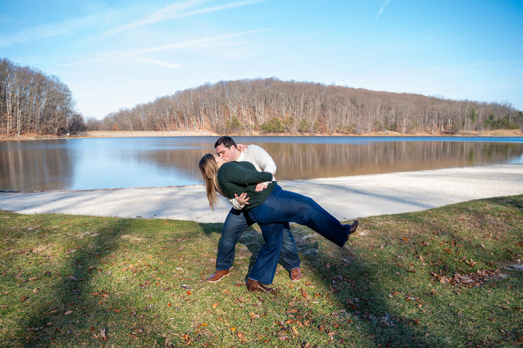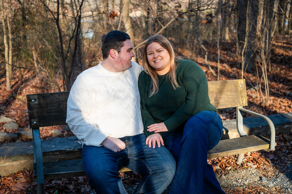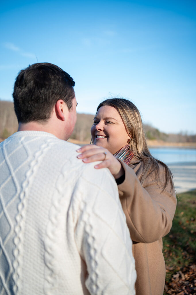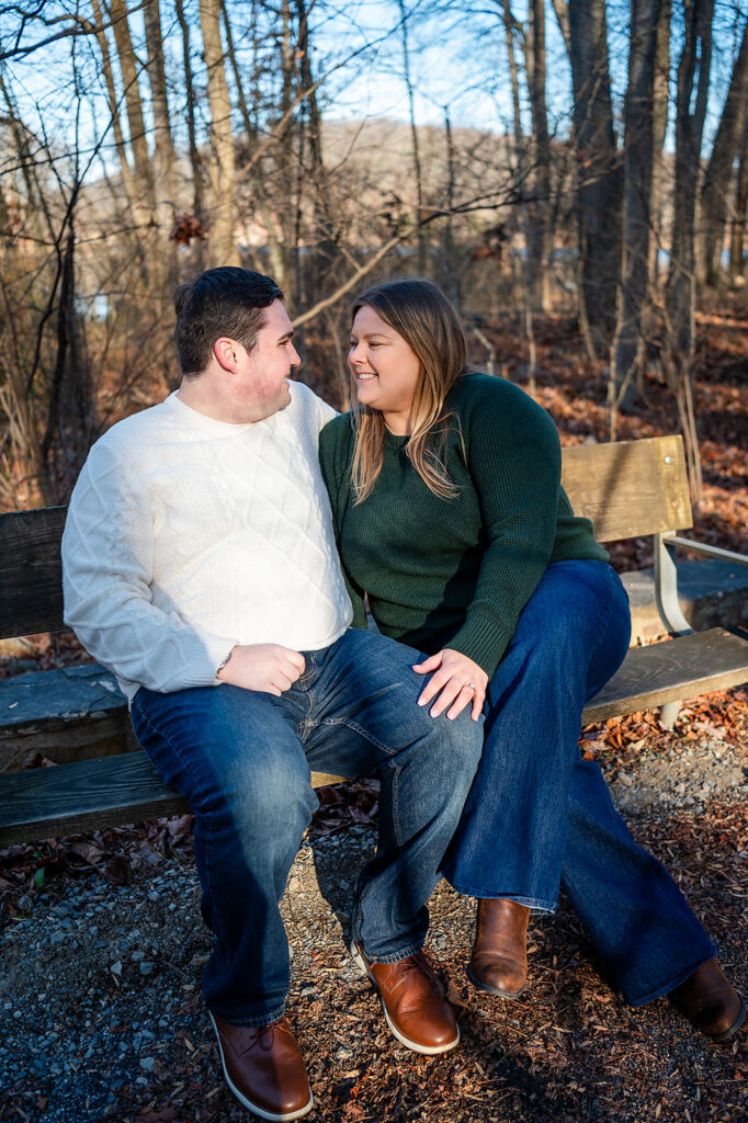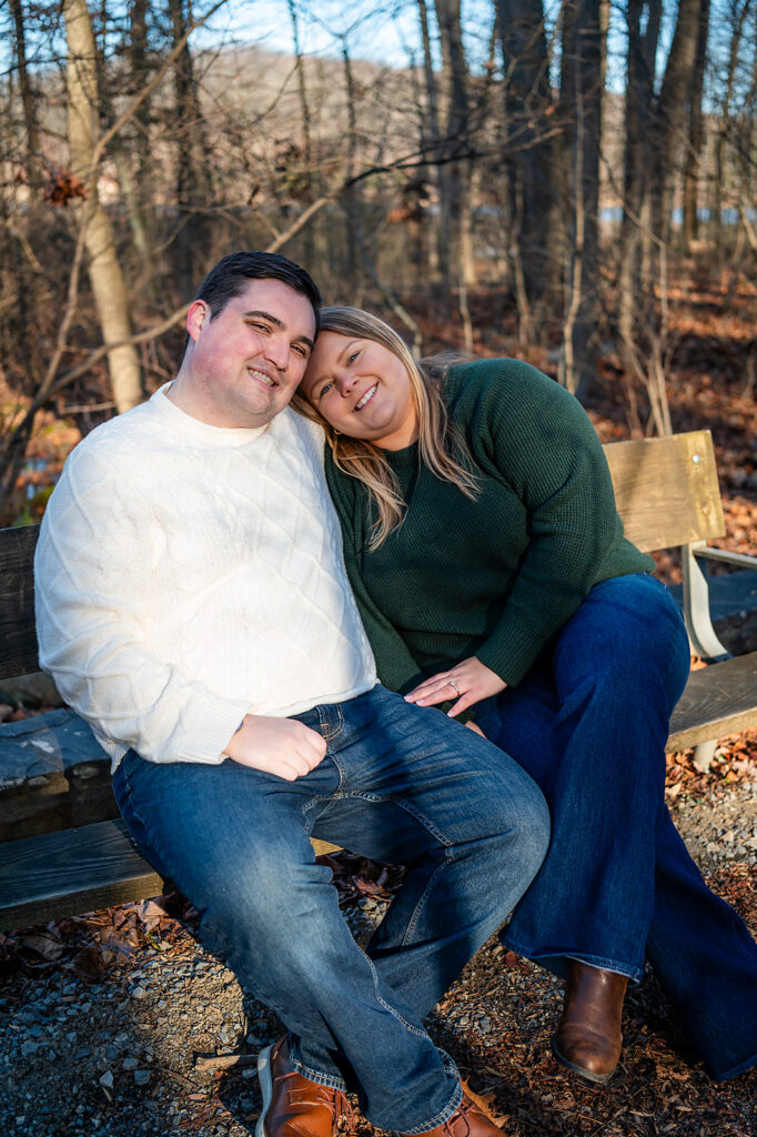 I met up with Jess and Chris on a cold winter day at a beautiful park featuring stunning scenes of water and woods. But the chill couldn’t touch the warmth of their connection! They brought their adorable dog, and I captured some truly amazing shots. I was lucky enough to catch the light just right, resulting in some images where the sun flare is pure magic, illuminating their love and making the whole scene glow. It was so helpful to spend this time with them; it only made me more excited for their upcoming wedding!