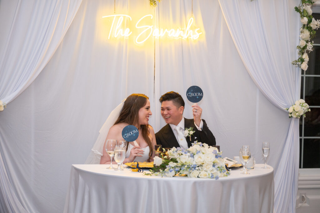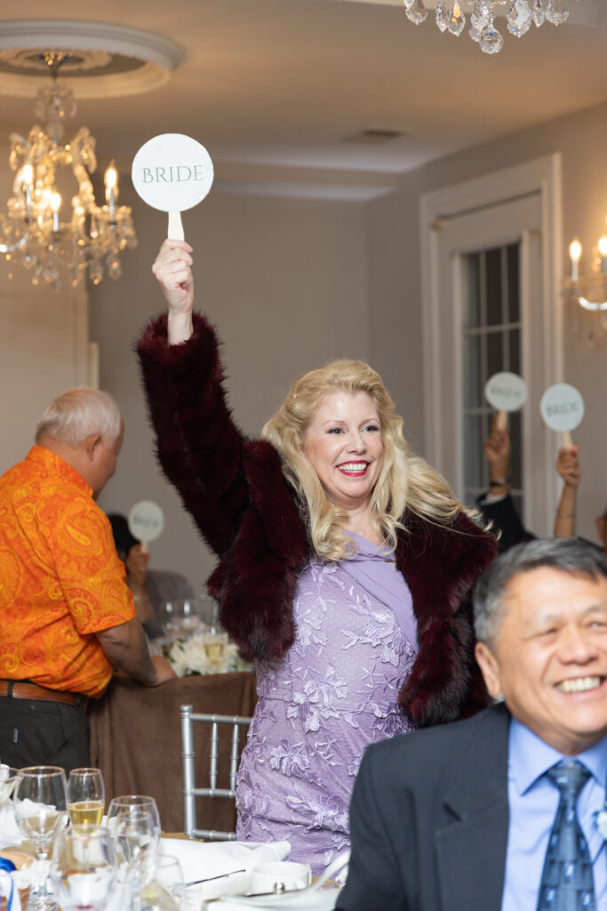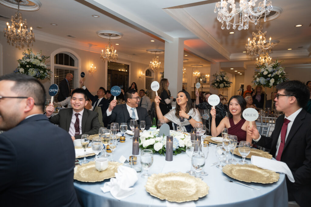One of the night’s biggest hits was a fun and interactive game! Every guest was given a paddle with “Bride” on one side and “Groom” on the other. The DJ asked fun trivia questions about the couple, the guests held up their guesses, and then Kendall and Wattana revealed the true answer. It was a hilarious way to involve everyone and see just how well their friends and family knew them!