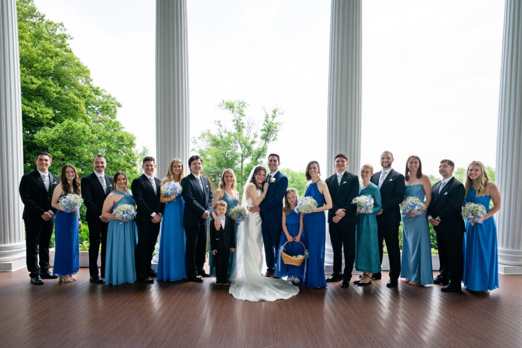 The reception space, the beautifully restored Carriage House, seats up to 175 guests and carries that same historic warmth as the rest of the estate. It’s elegant without being cold, romantic without being fussy. And on the ceremony side, whether couples choose the iconic portico steps, the open lawn with mountain views, or the intimate terrace, every option gives me something stunning to work with.